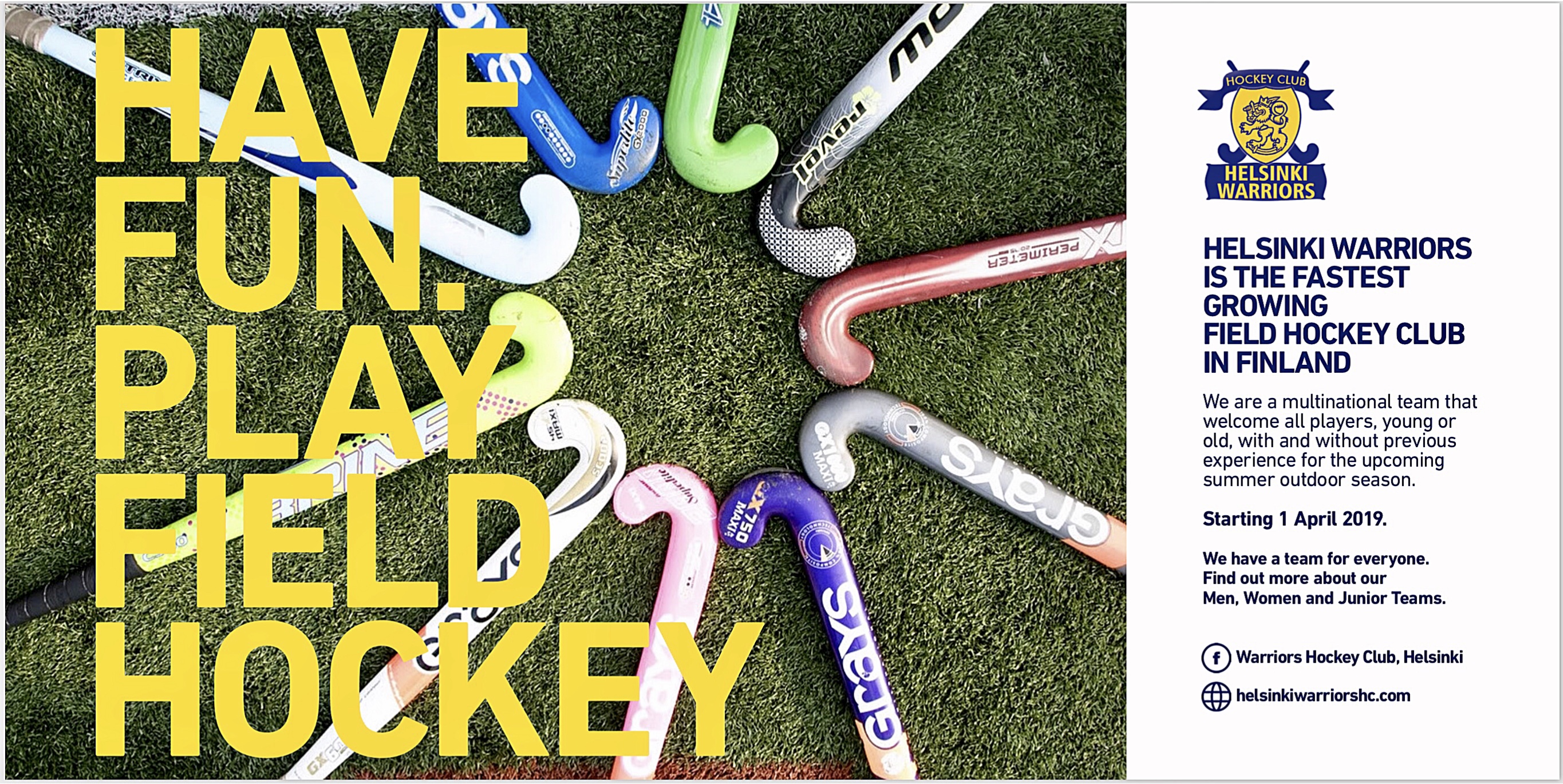 Helsinki Warriors is the fastest growing field hockey club in Finland. We are a multinational team that welcome all players, young or old, with or without previous experience, for the upcoming summer outdoor season starting on 1 April 2019.