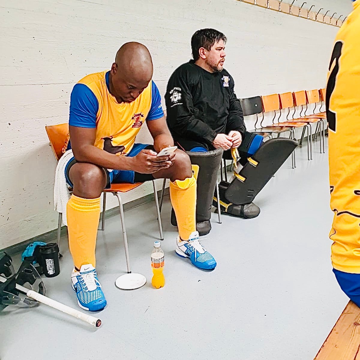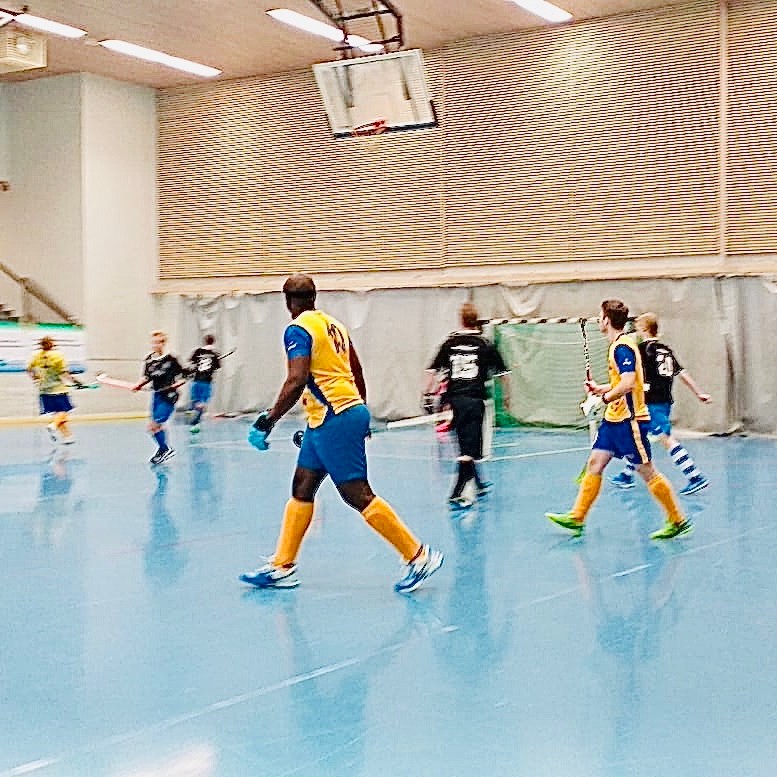 The Helsinki Warriors 1st-Division Mixed team had a fantastic day at the Mixed Division indoor hockey tournament in Myyrmäki today. The team is looking good as they continue their bid in the indoor season. Here Elisa, our captain for today can be seen snapping one of the players snacking on a doughnut with a fellow ABC player, Martina, joining in.