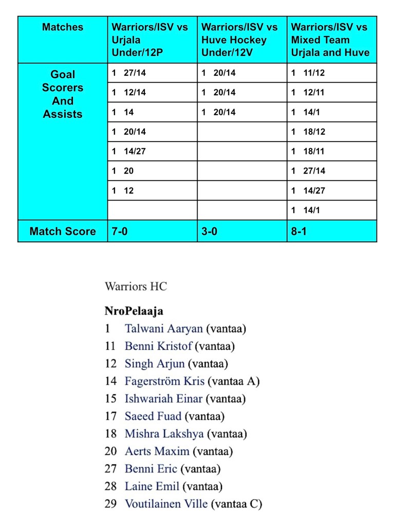 The team played three matches of which two results were officially recorded. In their first match the Helsinki Warriors beat Urjala by 7-0 in the span of 20 minutes. In their second encounter they beat HuVeHockey by 3 goals to 0. In their third encounter they convincingly beat a combined Urjala and Huve team by 8-1. The team squandered several opportunities in their second encounter by narrowly missing the goals. We are naturally working on becoming better. If you would like to join our under 12 team, you are welcome to join us for training in our school gym on Mondays from 15h00 till 16h30, at the International School of Vantaa. Boys and girls are most welcome. Letโs start a hockey revolution!
